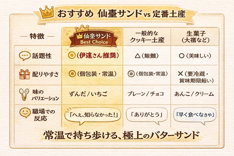 | 特徴 | 仙臺サンド | 一般的なクッキー土産 | 生菓子(大福など) |